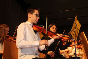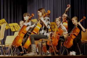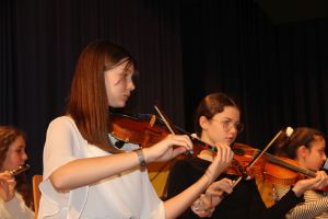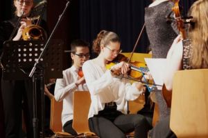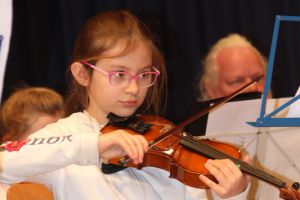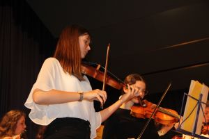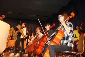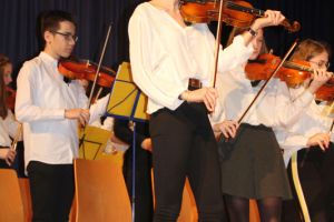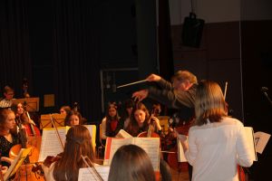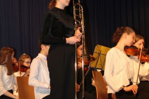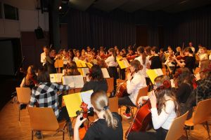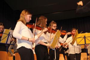 Wie gewohnt eröffnete unser Orchester als gastgebende Schule den Konzert-Vormittag. Mit unserer Dirigentin Cornelia Krones hatten die jungen Streicher und Bläser aus den Klassenstufen 5 bis 10 unter anderem den „Marsch aus Fidelio“ von W. A. Mozart einstudiert. Als nächstes bekamen die Zuhörer Mozarts „Romanze“ aus dem Hornkonzert mit einem besonderen Posaunensolo von Schülerin Julia Jaschek zu hören. Der krönende Abschluss unseres Orchesters bildete das „Feuerfest“ von Josef Strauss.