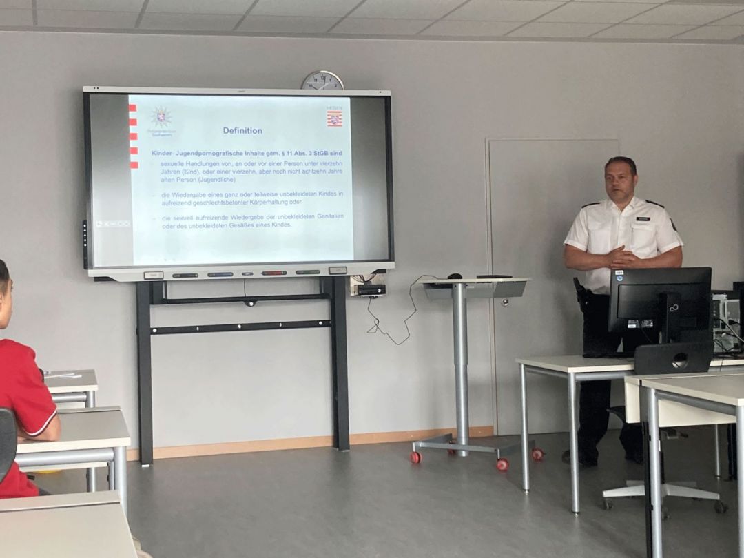 Am 12. Mai 2022 war die 9Gb bei einem solchen Vortrag von Polizeihauptkommissar Becker zu Gast. Er schilderte den Schüler mögliche Gefahren des Internet und klärte sie mithilfe einer PowerPoint-Präsentation auf. Hierbei erläuterte er zuerst die allgemeine Definition von kinder- und jugendpornographischen Inhalten: Darunter versteht man eine sexuelle Handlung von, an oder vor einem Kind (unter 14 Jahre) oder einem Jugendlichen (über 14, aber noch nicht 18 Jahre).