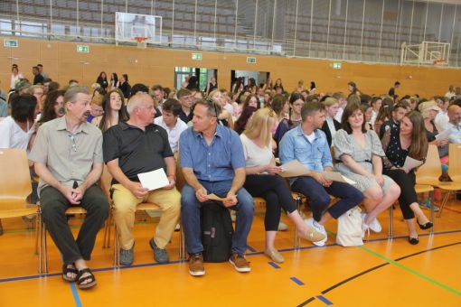 „Eure Schulzeit war von der Bautätigkeit und den Provisorien an unserer Schule geprägt. Letztendlich hat euer Jahrgang aber schon davon profitieren können und bereits in den neuen Lernlandschaften gelernt“, merkte Sabine Behling an. Gemeinsam mit den sozial engagierten Schülerinnen und Schülern sei es der Aueschule gelungen, das sehr begehrte Gesamtzertifikat „Gesundheitsfördernde Schule“ zu erlangen: Viele der anwesenden Abgänger und Schulwechsler haben als „Buddys“ Fünftklässlern beim Eingewöhnen in der neuen Schule geholfen, als Streitschlichter, Schulsanitäter oder Schulwegeplaner mitgeholfen. „Vielen Dank dafür!“, so die Schulleiterin weiter. Mit dem Heinrich-Heine-Zitat „Geld ist rund und rollt weg, aber Bildung bleibt“ verabschiedete sich die Direktorin von ihren Schülerinnen und Schülern. Zudem bedankte sie sich bei den Klassenlehrerinnen und -lehrern der Abgänger und Schulwechsler: bei Peter Kahnt (9Ha), Annika Fußhoeller (9Hb), Thomas Müller (10H), Sibylle Lorenz-Bollig (10Ra), Sven Knöspel (10Rb), Jan-Henning Fischer (10Ga) und Axel Preiss (10Gb).