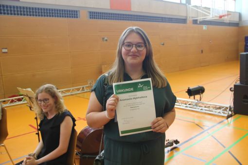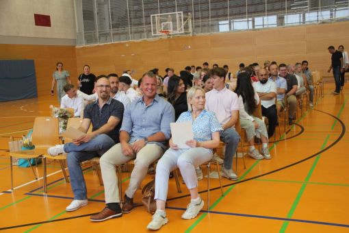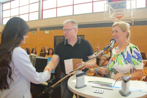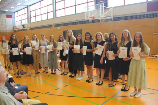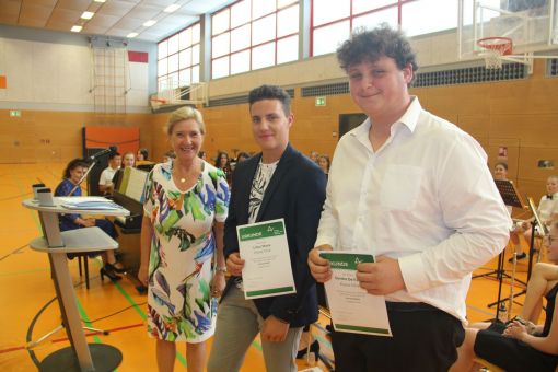 In die E-Phase der Oberstufe der „Alfred-Delp-Schule“ wechseln zwei Drittel der Gymnasiasten, ein Drittel von ihnen an die „Landrat-Gruber-Schule“ (LGS). 48 qualifizierende Realschulabschlüsse wurden vergeben, davon neun in der 10. Hauptschulklasse. 30 qualifizierende Hauptschulabschlüsse erarbeiteten sich die Neuntklässler des Hauptschulzweiges. Besonders erfolgreich schnitten die klassenbesten Schulabgängerinnen und -abgänger ab, die von Frau Behling und ihrem Kollegen Beyer mit Urkunden geehrt wurden. In diesem Schuljahr erreichten die Gymnasiastin Julie Gleitsmann (10Ga) und die Realschülerin Aurelia Chanel Risplendente (10Rb) jeweils mit der Traumnote 1,1 die besten Zeugnisse ihres Jahrgangs. Mit der Note 1,2 wurde Gymnasiastin Milla Berwanger aus der 10Gb die Klassenbeste. Die Hauptschülerin Diana Wahidi (9Ha) erreichte mit 1,2 das beste Zeugnis ihrer Klasse, Sabiren Abdillahi Hussein (9Hb) mit 1,3. Ghazal Abdullah war mit 1,4 die beste Realschülerin der 10Ra. Atakan Cakmak freute sich über seine Durchschnittsnote von 1,6, womit er der Klassenbeste der 10H war.