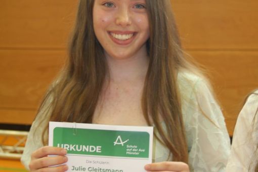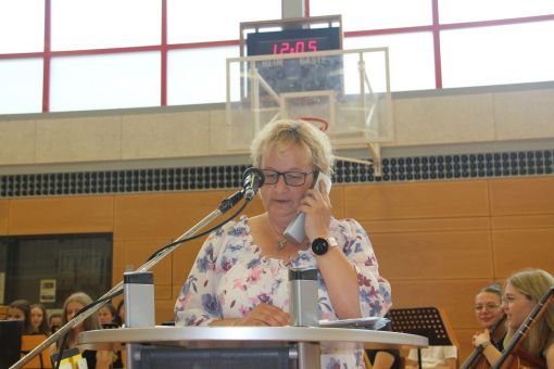 Grußworte an die Schülerinnen und Schüler richtete zudem Schulelternbeirätin Sandra Seibel in Form eines kurzweiligen „Telefonats“. Schulsprecher Chris Cramer blickte in seiner Rede auf seine Zeit an der Aueschule zurück. Münsters Bürgermeister Joachim Schledt rief die Schulabgängerinnen und -abgänger dazu auf, sich bei ihrer Arbeit nicht auf Künstliche Intelligenzen wie „Chat GPT“ zu verlassen, sondern den eigenen Kopf einzuschalten.