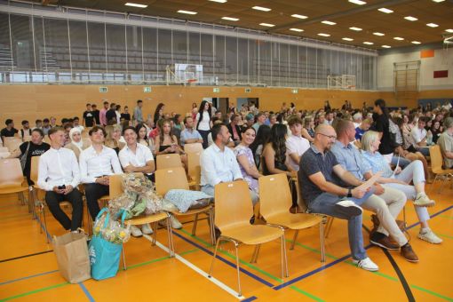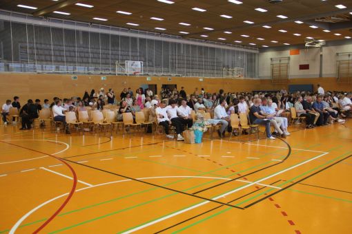Unsere Schule hat am Freitag (14. Juli) im Rahmen einer Akademischen Feier 170 Schülerinnen und Schüler aus den Haupt- und Realschuljahrgängen 9 und 10 sowie zwei zehnten Gymnasialklassen in die berufliche oder schulische Zukunft verabschiedet. Alle Klassen erschienen gemeinsam mit ihren Familien in der gut gefüllten Gersprenzhalle. Schulleiterin Sabine Behling und ihr Stellvertreter Matthias Beyer begrüßten in der fünften und sechsten Unterrichtsstunde neben den jeweiligen Schulabgängern auch viele Lehrerinnen und Lehrer, die die Absolventen unterrichteten. „Ich freue mich besonders, dass nach den harten Coronajahren eine Rückkehr zur Normalität stattgefunden hat und diese Feierstunde wie vorher durchgeführt werden kann“, erklärte die Direktorin. Ausdrücklich bedankte sie sich bei ihrem Schul-Orchester unter der Leitung von Cornelia Krones, das die Feierstunde mit klassischen Klängen untermalte.