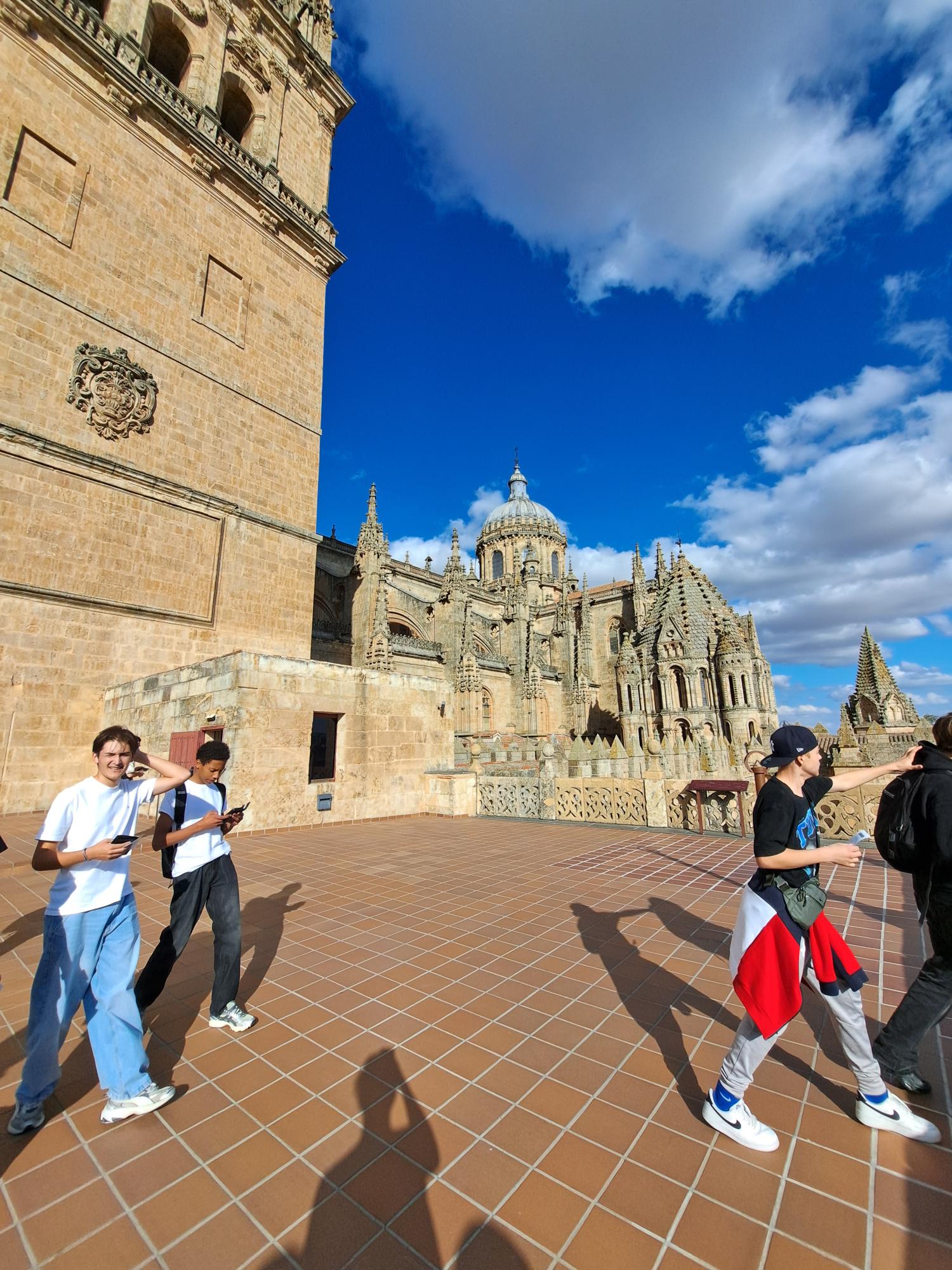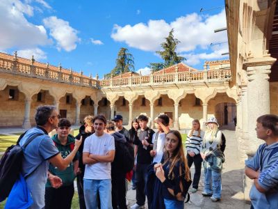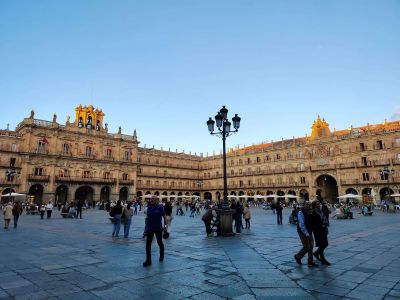 Nicht weit davon entfernt liegt der Plaza Mayor, das Herz Salamancas. Der Platz entstand im 18. Jahrhundert im Barockstil und ist fast quadratisch – etwa 80 Meter lang und breit – und wird von 88 Bögen mit Cafés und Restaurants umgeben. Besonders auffällig ist das Rathaus mit seiner prachtvollen Fassade. Am Tag herrscht hier immer Trubel: Kaffee trinken, Kinder lachen, Musiker singen. Abends, wenn der Platz beleuchtet ist, wirkt alles in goldenes Licht getaucht. Außerdem findet man in der Nähe des Plaza Mayor viele Geschäfte. Nicht weit entfernt steht die Universidad de Salamanca – das Gebäude ist typisch spanisch: hell, offen und mit einem kleinen Innenhof.