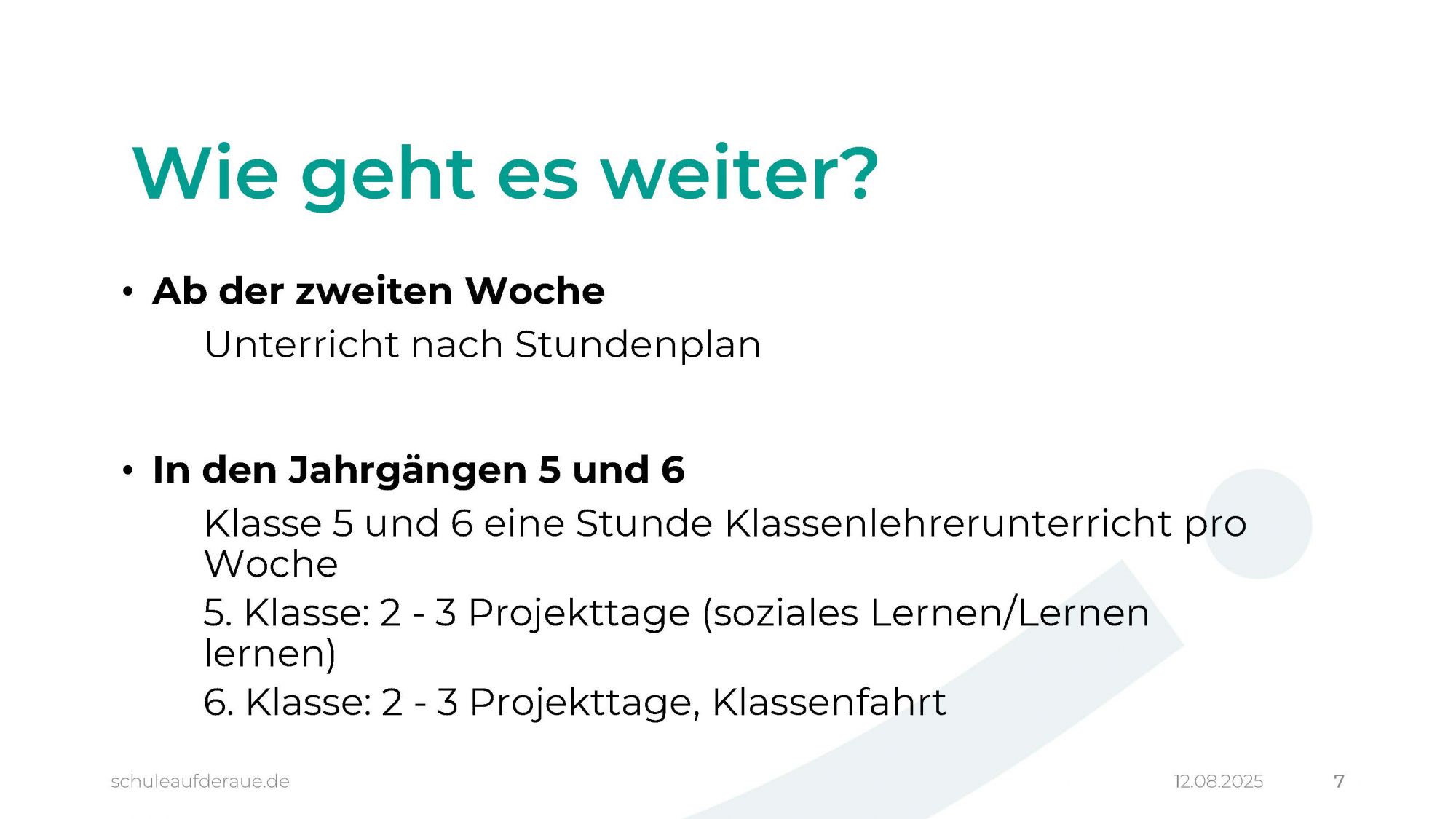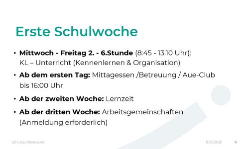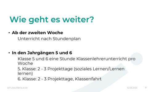 In der ersten Schulwoche steht das Kennenlernen der Klasse und der Schule im Vordergrund. Ab der zweiten Woche gilt der reguläre Stundenplan, ergänzt durch Lernzeiten, Arbeitsgemeinschaften und besondere Projekttage. Unser Ziel ist es, die Kinder Schritt für Schritt an das Lernen in der Förderstufe bzw. im Gymnasialzweig heranzuführen – mit einer Mischung aus Organisation, gemeinschaftlichen Erlebnissen und gezielter Förderung.