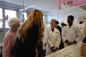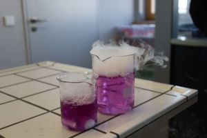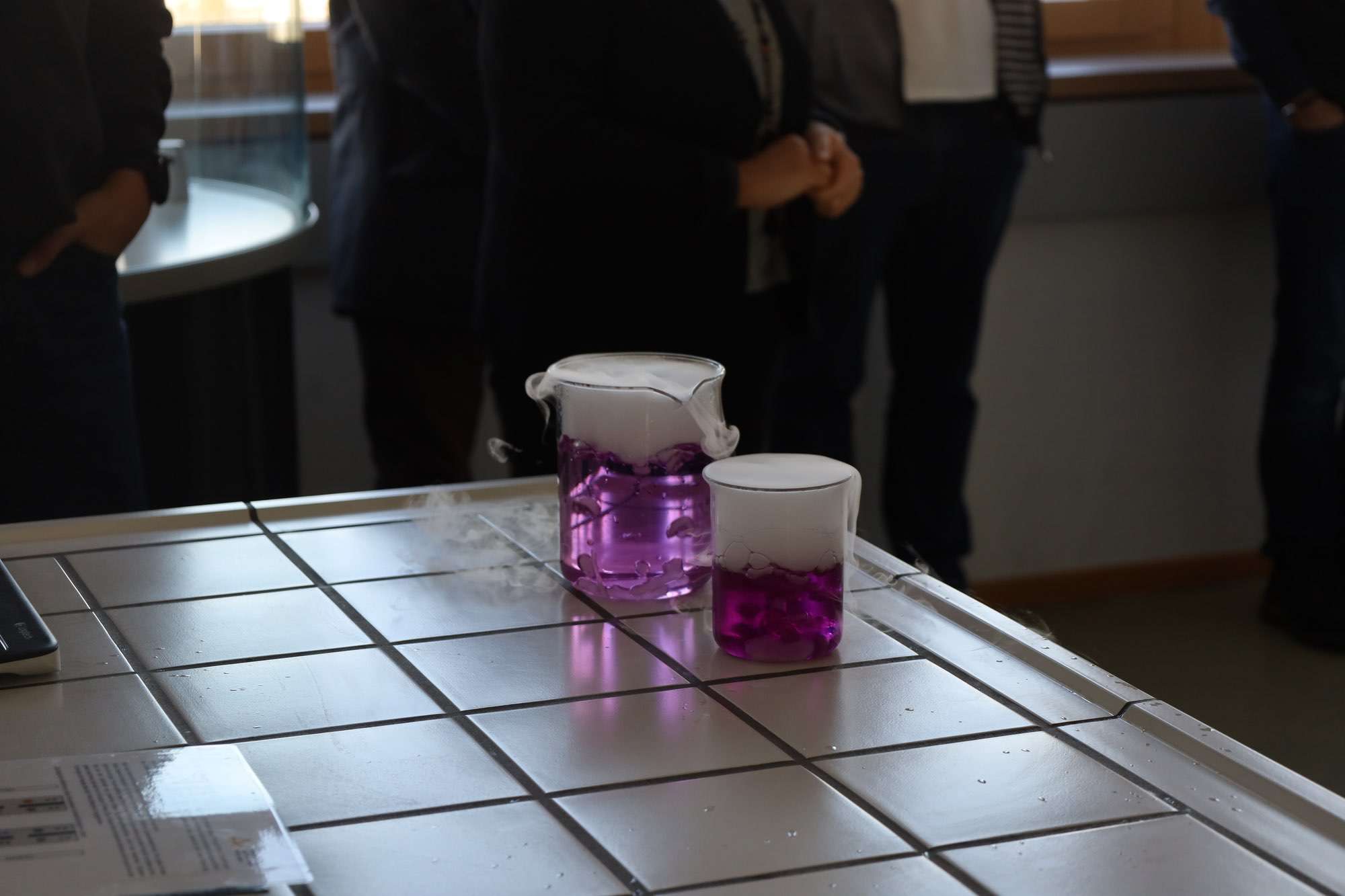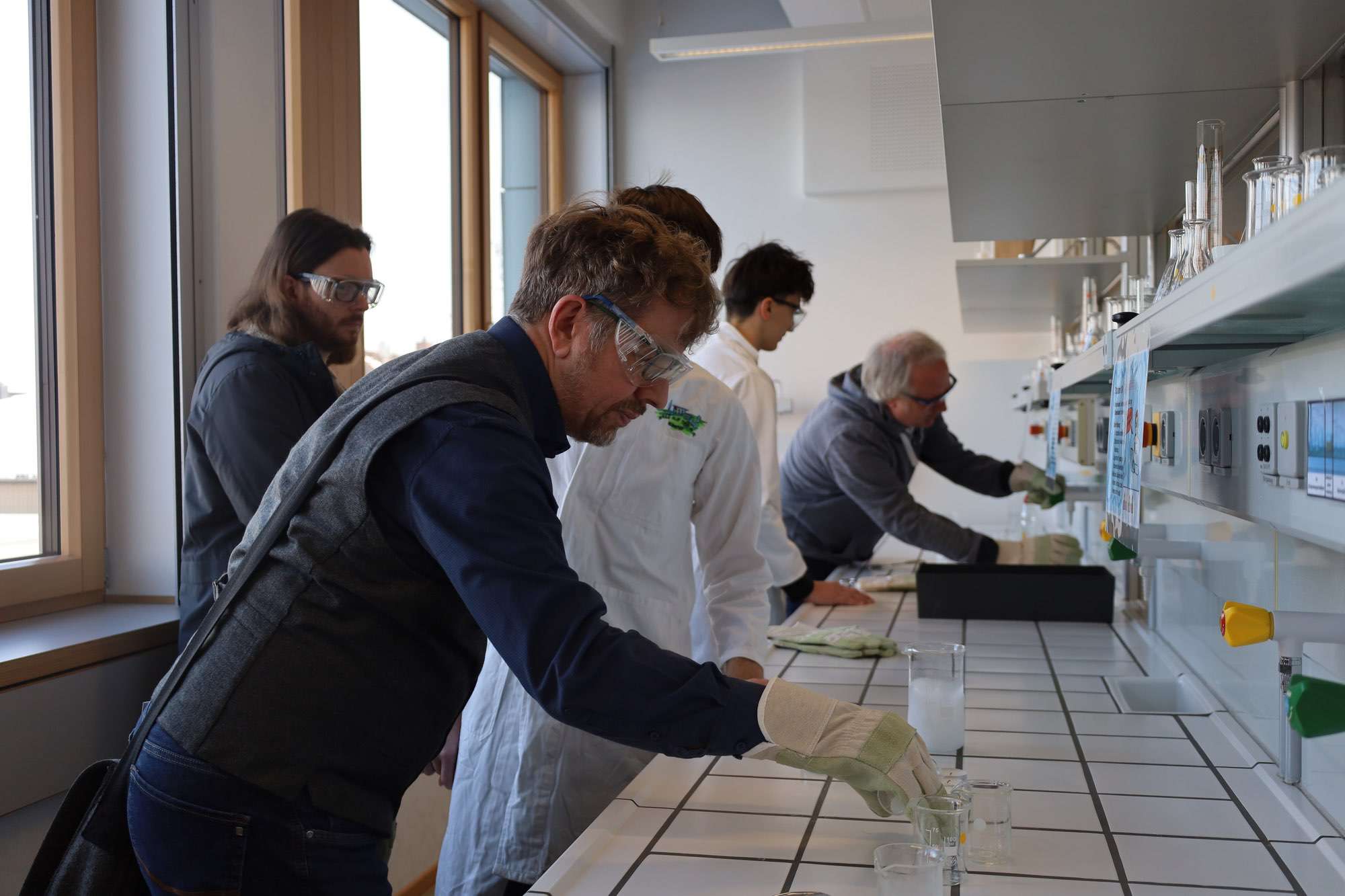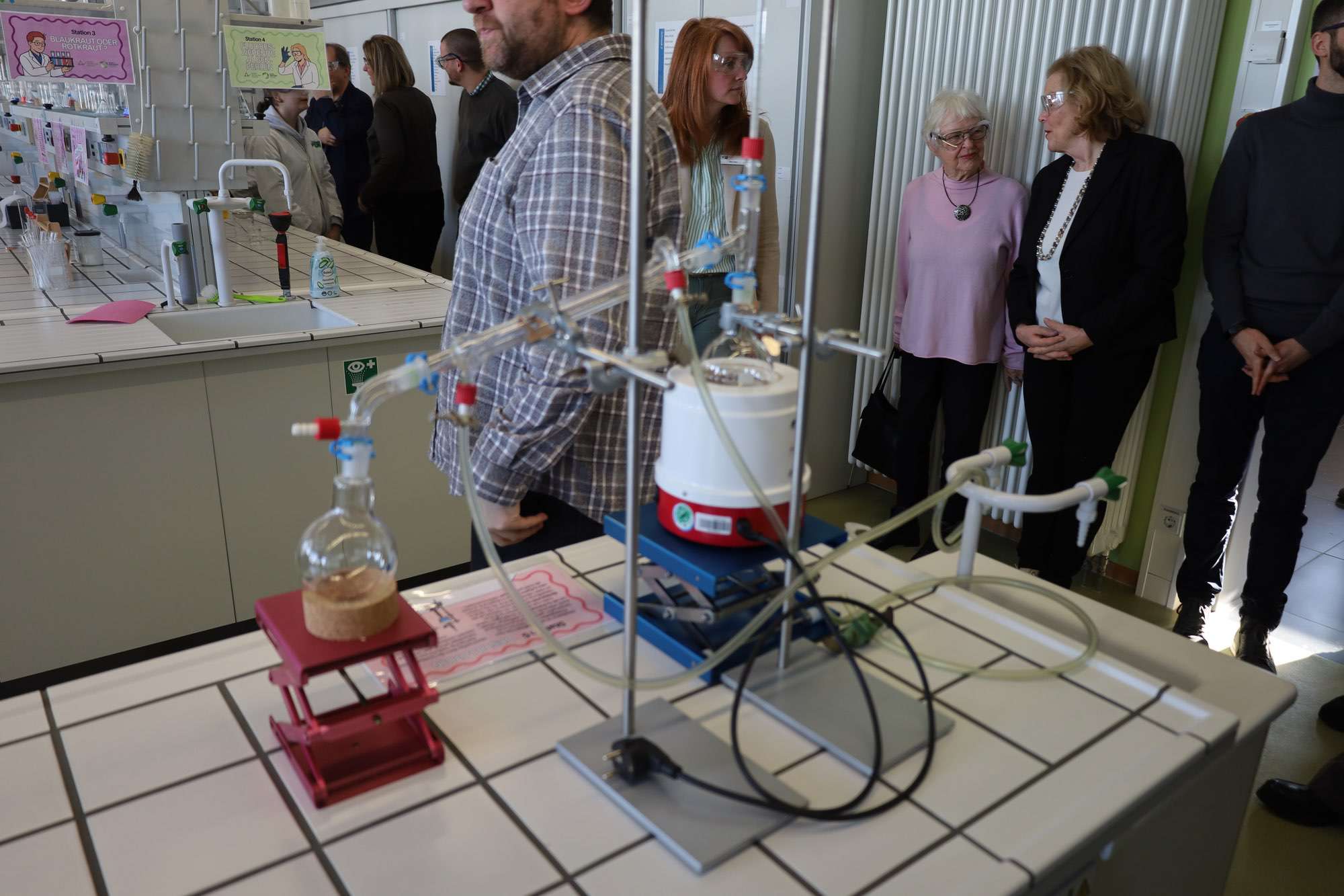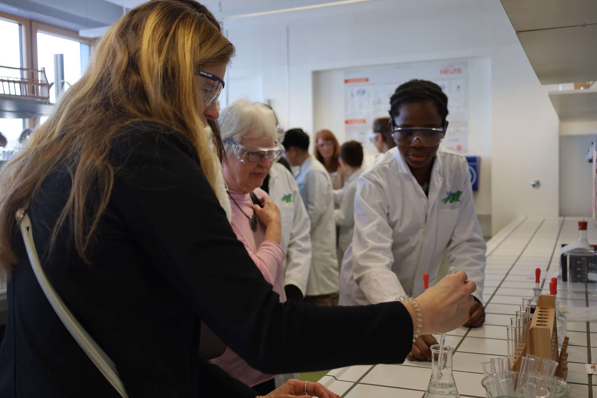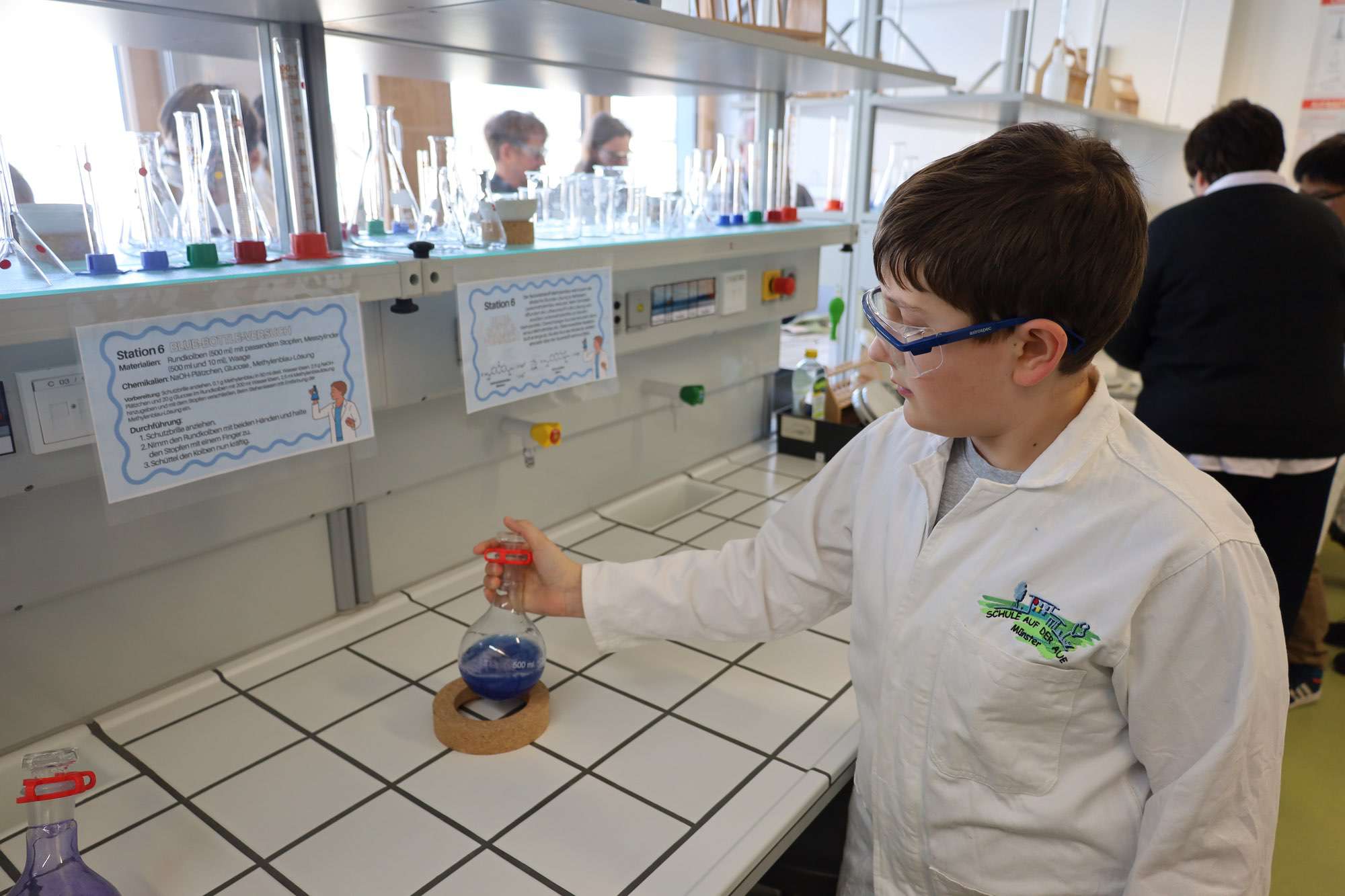 Selbst zu Reagenzgläsern und bunten Flüssigkeiten greifen konnten schließlich alle erwachsenen Gäste im hellen, freundlichen Labor der Aueschule: Lehrerin Heyn bereitete dort an mehreren Stationen Experimente vor, an denen bereits Nachwuchswissenschaftler warteten. Mit Schutzbrille und im weißen Kittel leiteten sie die Erwachsenen an und sorgten so für lebendige Beispiele einer naturwissenschaftlichen Lernumgebung, die Lust aufs Entdecken und Erforschen macht.